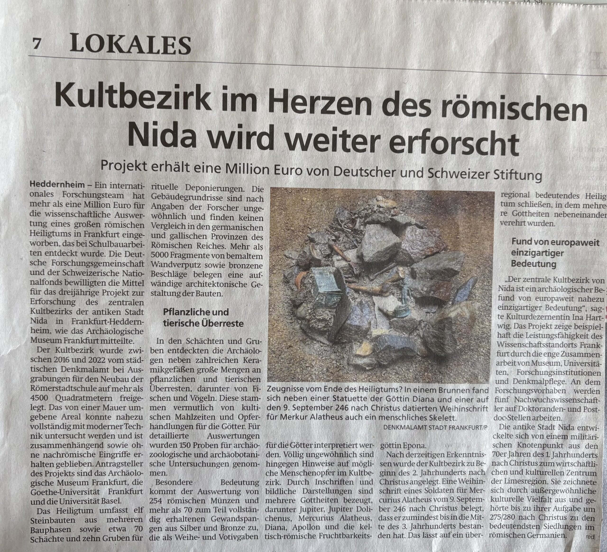 nbei ein Artikel, der am 27. Januar 2026 in der Frankfurter Rundschau erschienen ist, über den Schweizerischen Nationalfonds und die Deutsche Forschungsgemeinschaft, welche mehr als eine Million Euro für ein neues internationales Forschungsprojekt zur Erschließung von Frankfurts römischem Erbe und den neuen bedeutenden antiken Funde geben.